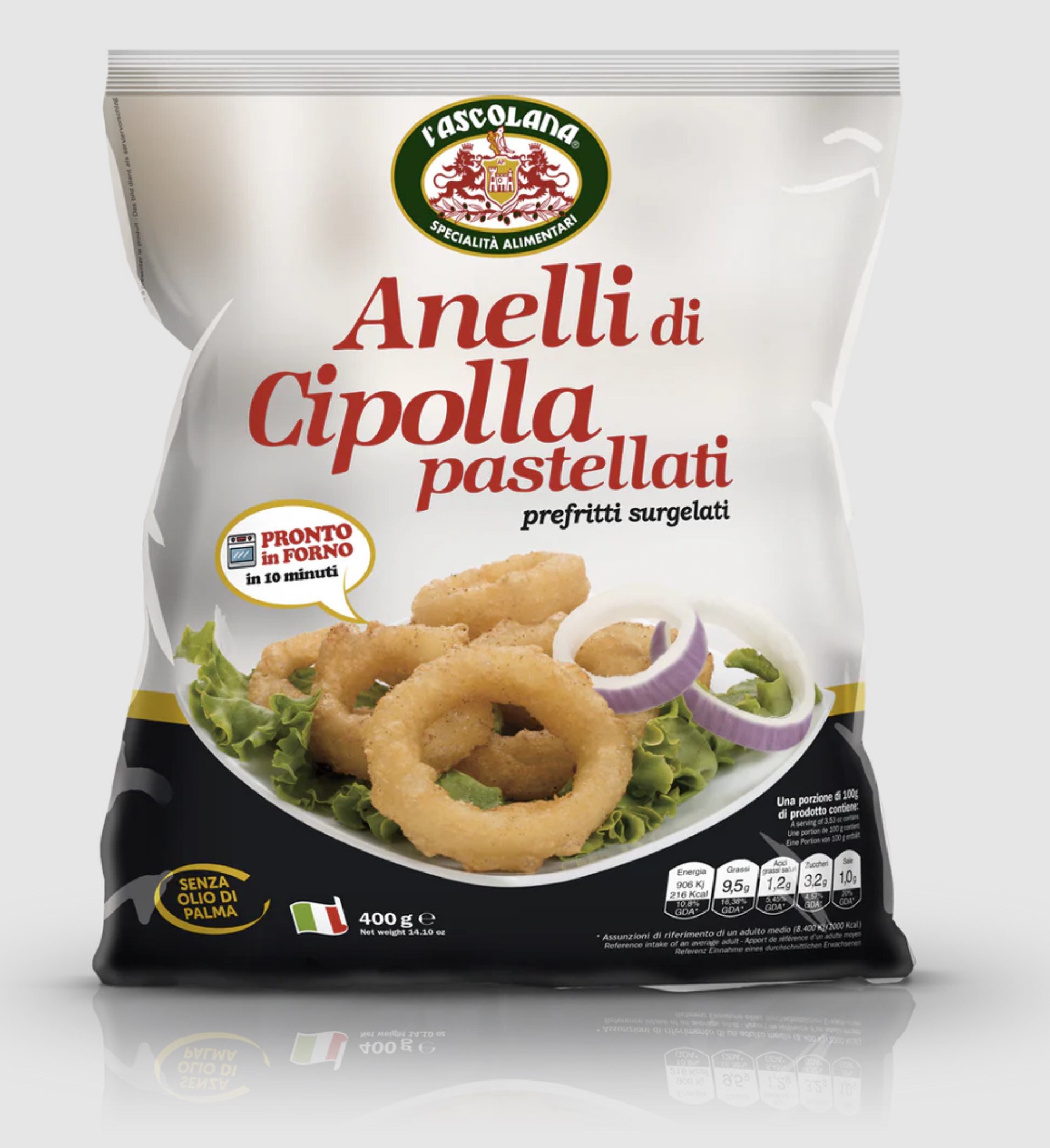Ingredienti: Pastella 62% (acqua, farina di FRUMENTO , olio di girasole, amido di mais, amido di FRUMENTO, sale, lievito, agenti lievitanti (E-500, E-450), addensanti (E-412, E-415)), cipolla 38% . Può contenere tracce di PESCE, CROSTACEI , MOLLUSCHI, FORMAGGIO, SOIA, SENAPE. Conservazione: il prodotto conserva le sue caratteristiche ottimali se consumato entro la data riportata sulla confezione. Una volta scongelato, il prodotto non deve essere ricongelato e deve essere consumato entro 24 h. Modalità di preparazione – In friggitrice: senza scongelare il prodotto, friggere gli anelli di cipolla in una padella o friggitrice