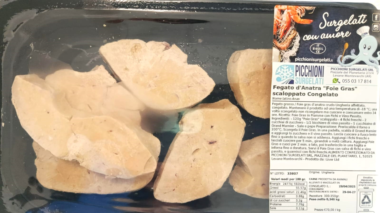 Fegato grasso / Foie gras d’anatra crudo Ungheria affettato, congelato. Mantenere il prodotto ad una temperatura di -18 °C; una volta scongelato non ricongelare ma cuocere e consumare entro 24 ore. Ricetta: Foie Gras in Fiamme con Fichi e Vino Passito.