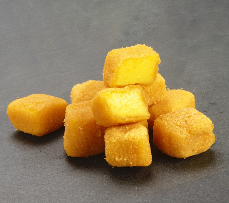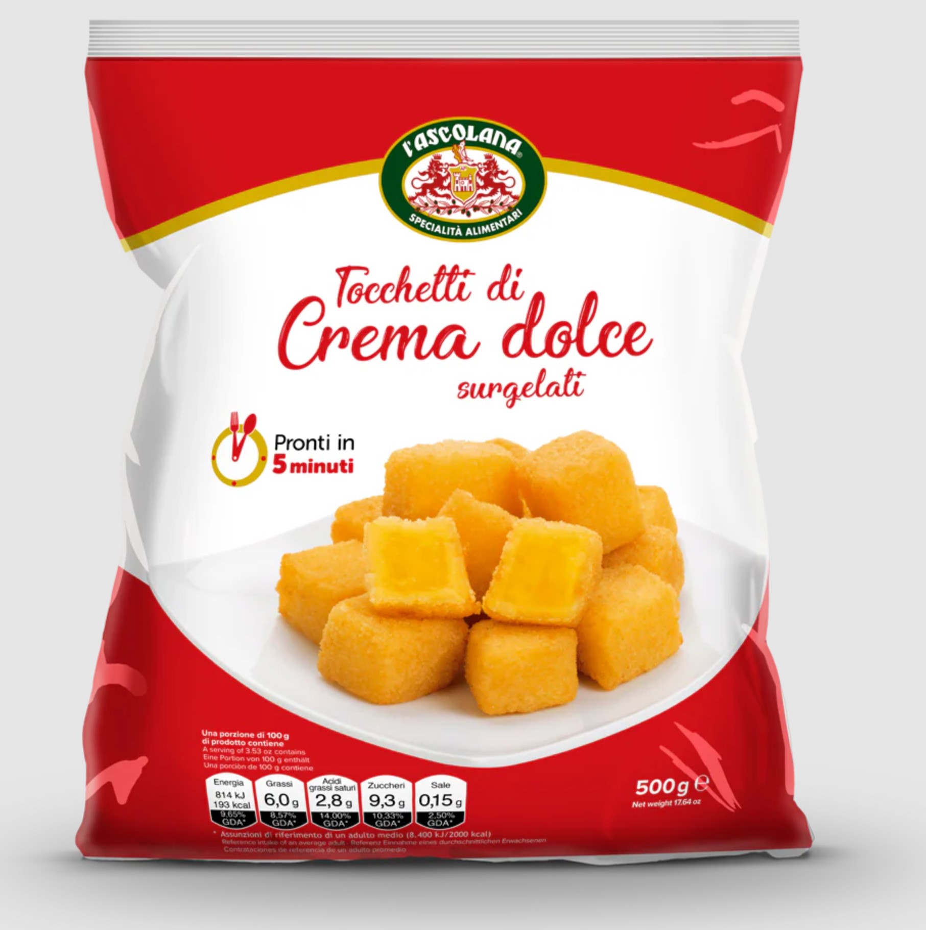 Ingredienti: Crema pasticcera 60%(LATTE vaccino in polvere reidratato, zucchero, farina di GRANO tenero tipo “00”, UOVA pastorizzate, buccia di limone, aroma: vanillina), salsa impanante (farina di mais, farina di FRUMENTO, amido di mais, olio di semi di girasole, sale, agenti lievitanti: bicarbonato acido di sodio E500(ii), difosfato disodico E450(i)), semilavorato per impanatura (farina di GRANO tenero tipo “0”, lievito di birra, sale, paprika), farina di GRANO tenero tipo “0”. Può contenere tracce di SEDANO, SOIA , METABISOLFITO DI SODIO , PESCE , MOLLUSCHI , CROSTACEI, SENAPE. Modalità di preparazione: In friggitrice : versare i tocchetti di crema, ancora surgelati, in abbondante olio bollente (180°C) e lasciare friggere 3 minuti circa fino a che appariranno ben dorati. Toglierli dall’olio e lasciarli asciugare su carta assorbente. Servirli tiepidi.